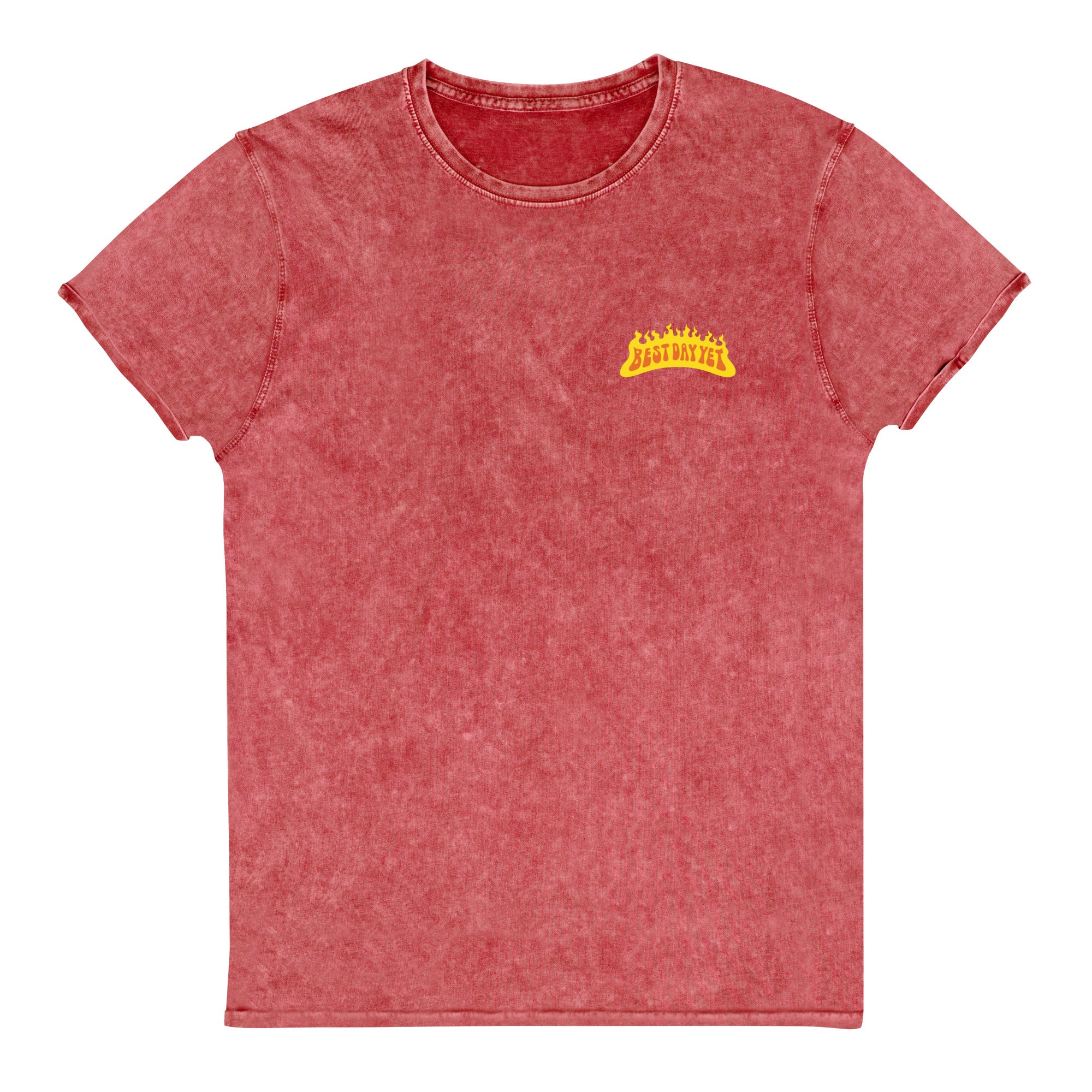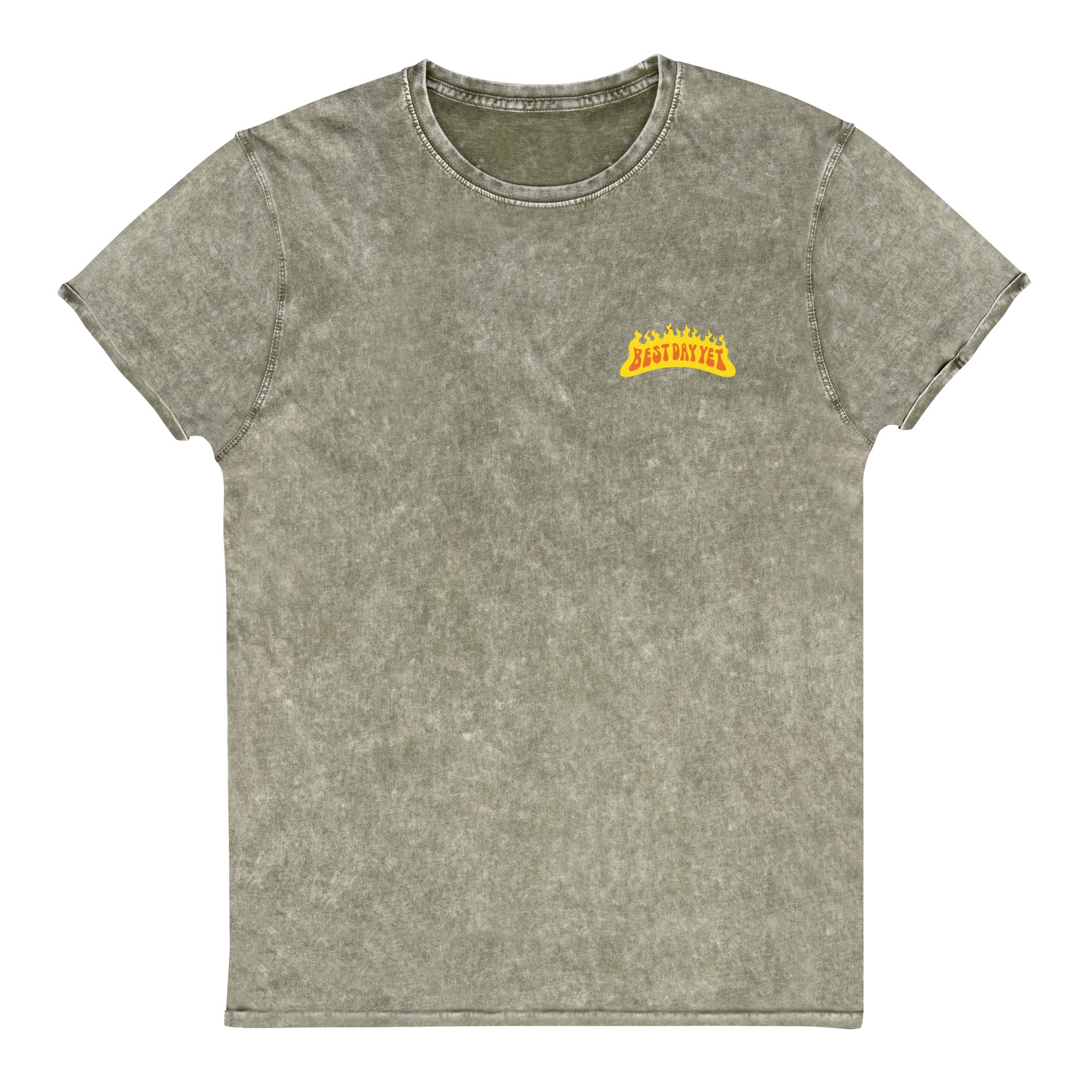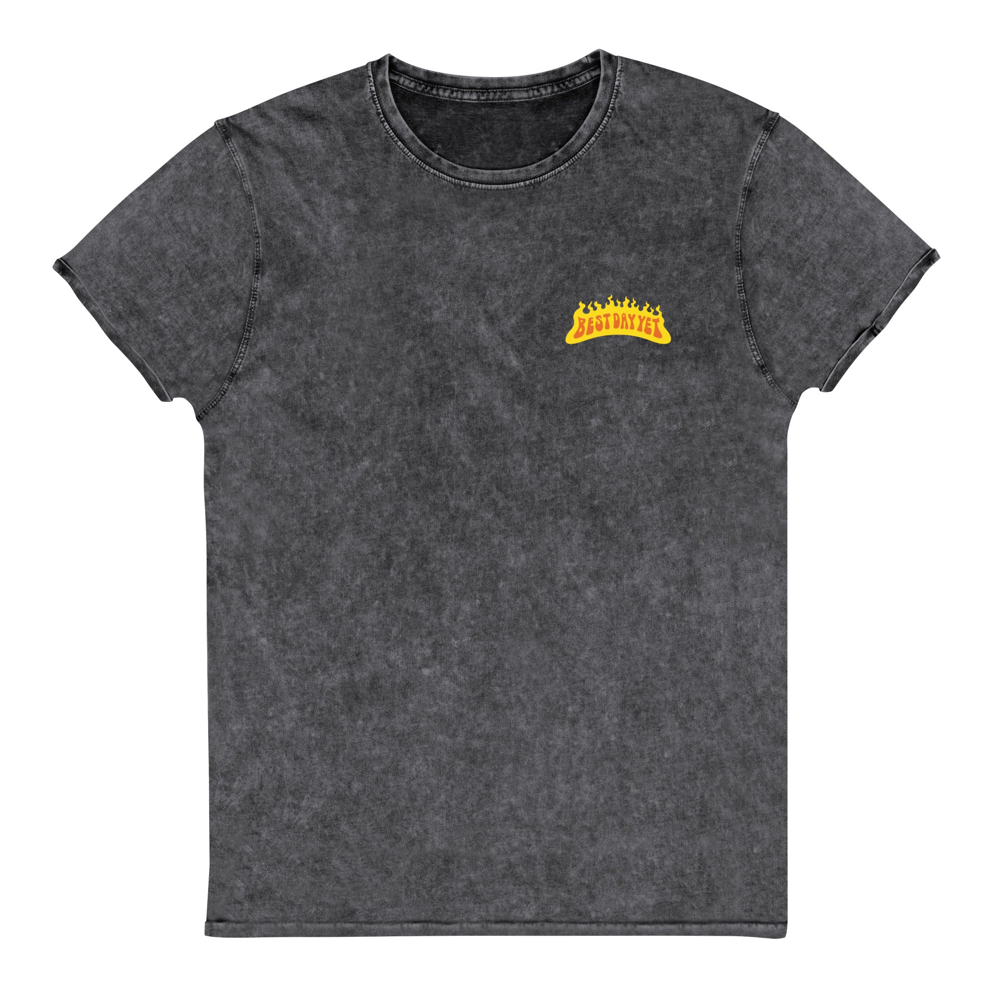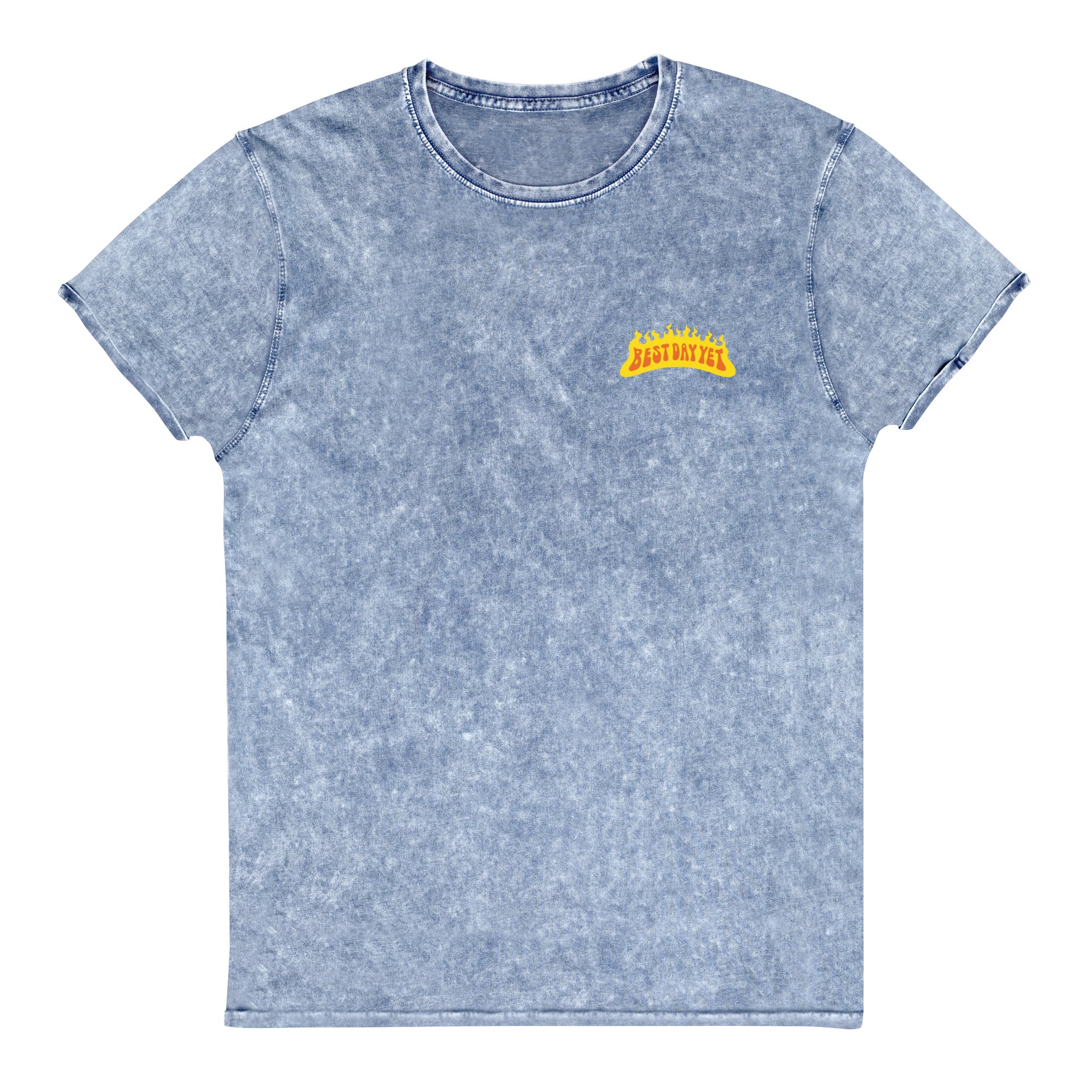 This denim t-shirt is made out of 100% combed cotton and has a classic rounded neckline with ribbed sleeve cuffs. It's soft, comfortable, and a must-have for every fashion enthusiast!